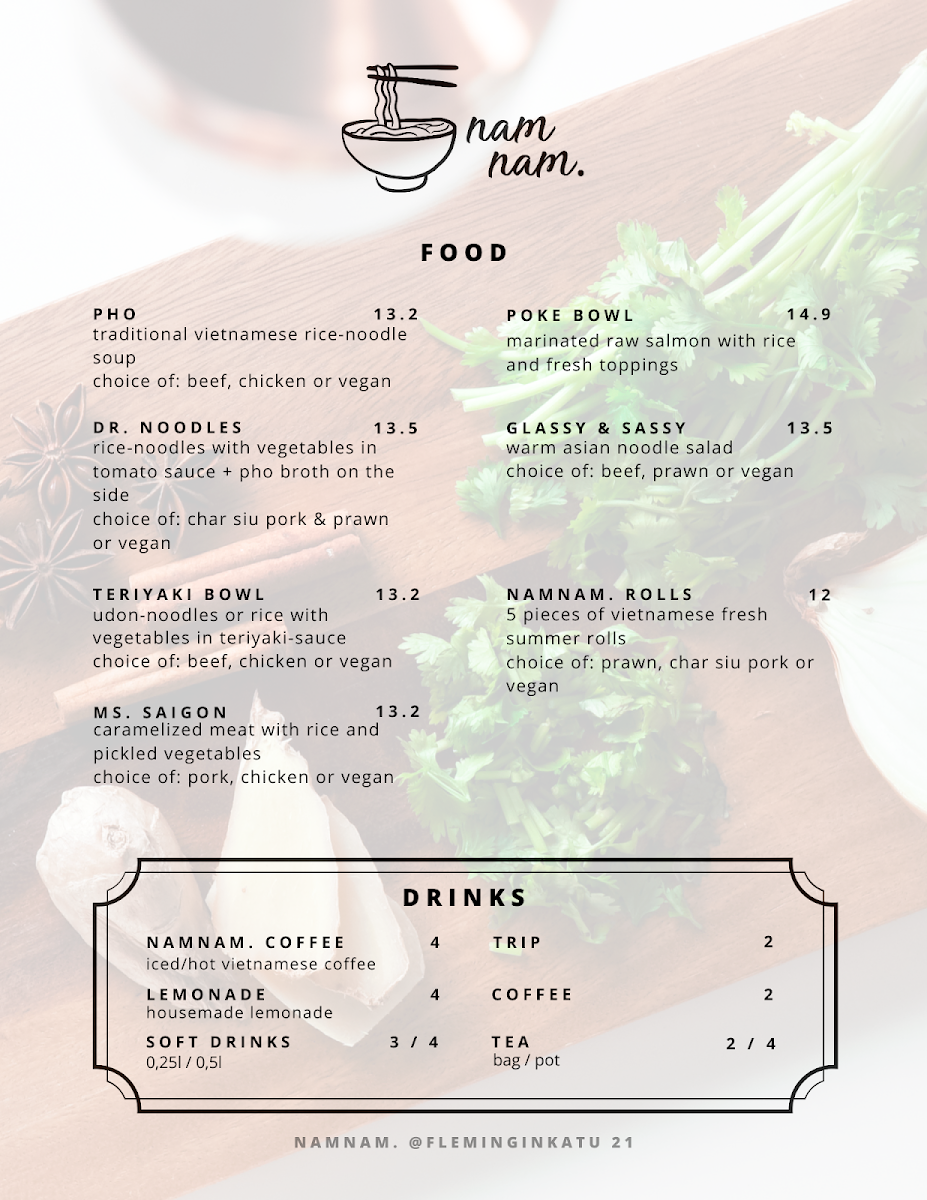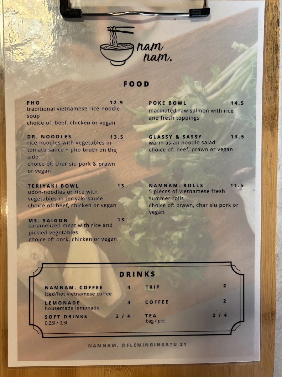 Welcome to namnam., a charming culinary gem tucked away on Fleminginkatu in Helsinki's Kallio district. This family-owned eatery delivers a delightful array of delicious Vietnamese dishes, making it a must-visit for food enthusiasts. The menu is concise yet impactful, featuring standout options like the vibrant Pho, adored by regulars for its authentic taste and comforting warmth.